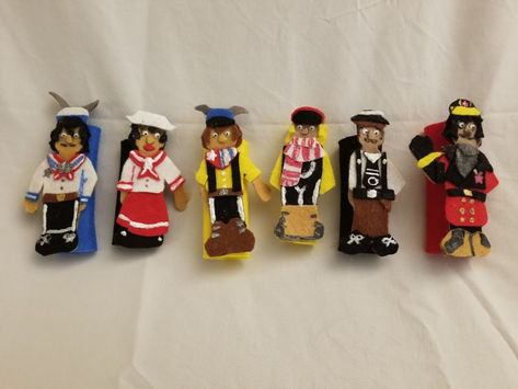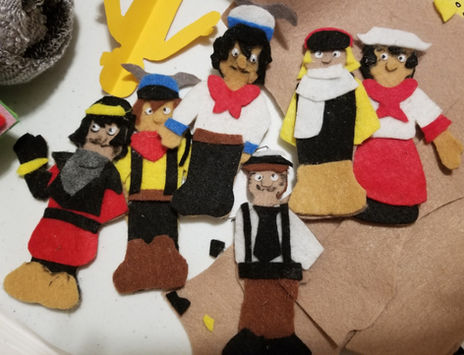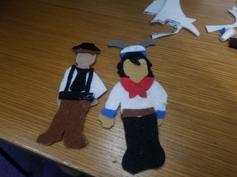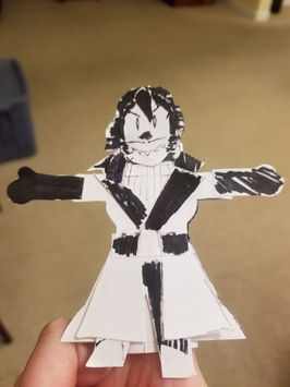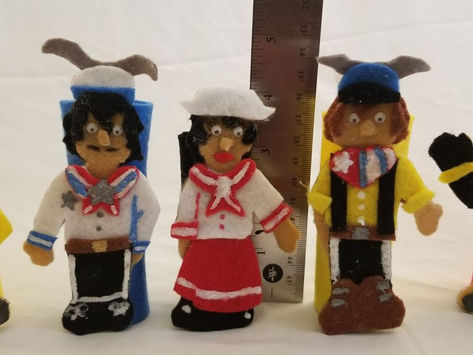 These finger puppets designed for a Puppetry course. I first sketched a proposed figure in Clip Studio Paint before I made a finger-sized puppet with paper. The material was changed to felt, and I lined each charcater's outfit with acrylic paint. The characters were attached to finger sleeves.