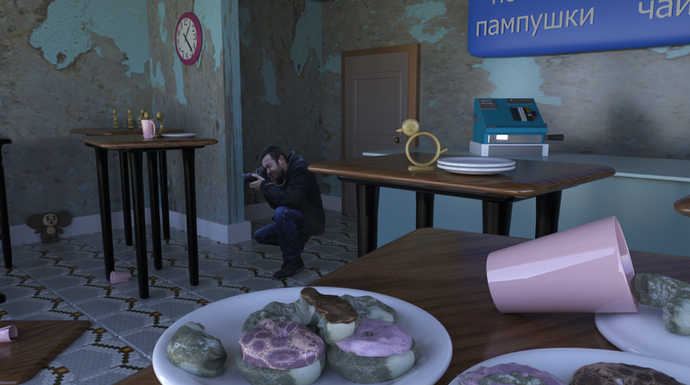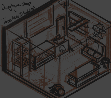 This room was mainly inspired by nuclear incidents in Chernobyl and Three Mile Island, as well as the changes I saw in my childhood city when I visited it. Doughnut shops were a common feature in Long Beach, CA, but they fell into disrepair and were abandoned as their owners moved out or retired. In this fictional shop, guests can get up close to abandoned restaurant equipment and wonder what life was like before the shop closed down.